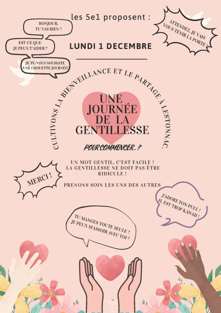 Dans ce cadre, les élèves de la classe de Mme Gros ont imaginé une action plus large. Ils ont choisi de sensibiliser l’ensemble du collège, mais aussi les lycéens et les adultes de l’établissement, autour d’un thème simple : la gentillesse. Ils ont ainsi créé « la journée de la gentillesse », destinée à encourager des gestes et des paroles bienveillants au quotidien. Pour rendre l’initiative visible, ils ont réalisé un visuel qu’ils ont affiché dans l’établissement afin d’inviter le plus grand nombre à participer. Cette journée a lieu lundi 1er décembre