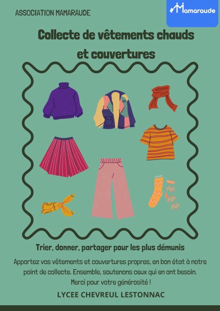 Dans la même période, une collecte gérée par des lycéens de Chevreul Lestonnac s’est déployée : une collecte solidaire de couvertures et de vêtements chauds. Le carton prévu a cet effet dans le hall d’entrée débordait ! Cela donnait du baume au coeur de constater jour après jour les dons augmenter.