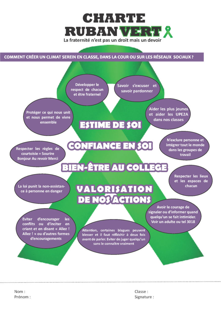 Les élèves signent cette charte sur plusieurs jours et reçoivent ensuite un ruban vert, symbole de leur engagement.